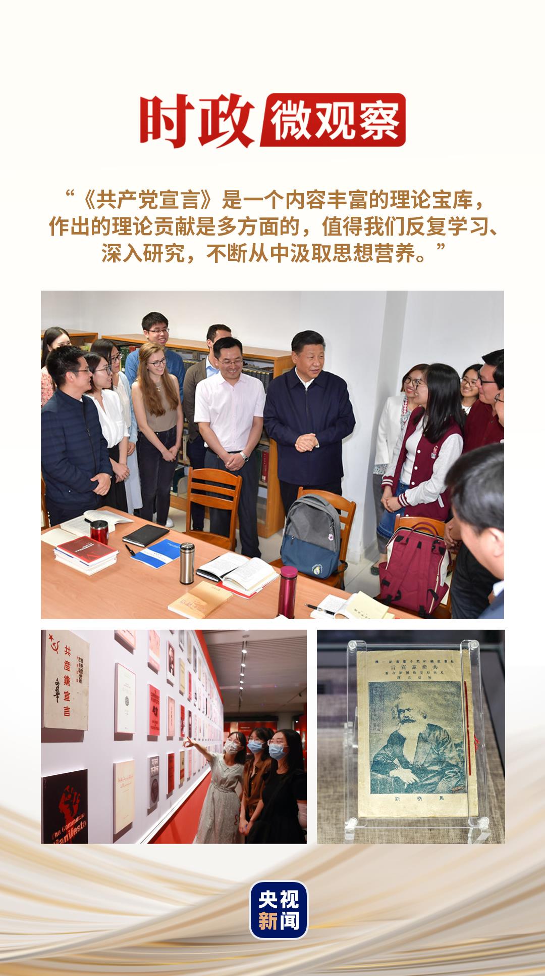 英國曼徹斯特,切塔姆圖書館,一張馬克思和恩格斯當(dāng)年伏案工作時(shí)使用過的長方形橡木書桌,記錄了一段珍貴的歷史。170多年前,正是在這張木桌前,馬克思與恩格斯查閱大量資料,展開思想交流,醞釀了包括《共產(chǎn)黨宣言》在內(nèi)的諸多馬克思主義經(jīng)典之作。 2018年4月23日,正值世界讀書日,習(xí)近平總書記主持十九屆中央政治局第五次集體學(xué)習(xí),學(xué)習(xí)內(nèi)容是《共產(chǎn)黨宣言》及其時(shí)代意義??倳洀?qiáng)調(diào),《共產(chǎn)黨宣言》是一個(gè)內(nèi)容豐富的理論寶庫,作出的理論貢獻(xiàn)是多方面的,值得我們反復(fù)學(xué)習(xí)、深入研究,不斷從中汲取思想營養(yǎng)。 從梁家河到中南海,《共產(chǎn)黨宣言》等馬克思主義經(jīng)典著作,習(xí)近平不知道讀了多少遍。他說:“如果心里覺得不踏實(shí),就去鉆研經(jīng)典著作,《共產(chǎn)黨宣言》多看幾遍?!?/p> 《共產(chǎn)黨宣言》里有什么?何以滋養(yǎng)一代又一代中國共產(chǎn)黨人?又一個(gè)世界讀書日,《時(shí)政微觀察》和你一起了解。 ——有真理 “真理的味道非常甜?!?/p> 黨的十八大閉幕后,剛剛當(dāng)選中共中央總書記的習(xí)近平在參觀《復(fù)興之路》大型展覽時(shí),指著一本泛黃的《共產(chǎn)黨宣言》,講述了這個(gè)“真理”的故事—— 一天,一個(gè)小伙子在家里奮筆疾書。媽媽在外面喊著說:“你吃粽子要加紅糖水,吃了嗎?”他說:“吃了吃了,甜極了。”老太太進(jìn)門一看,這個(gè)小伙子埋頭寫書,嘴上全是黑墨水。原來他吃錯(cuò)了,旁邊一碗紅糖水沒喝,卻把那個(gè)墨水給喝了,但他渾然不覺,還說,“可甜了,可甜了”。這人是誰呢?就是陳望道。他當(dāng)時(shí)在浙江義烏的家里,就是寫這本書。