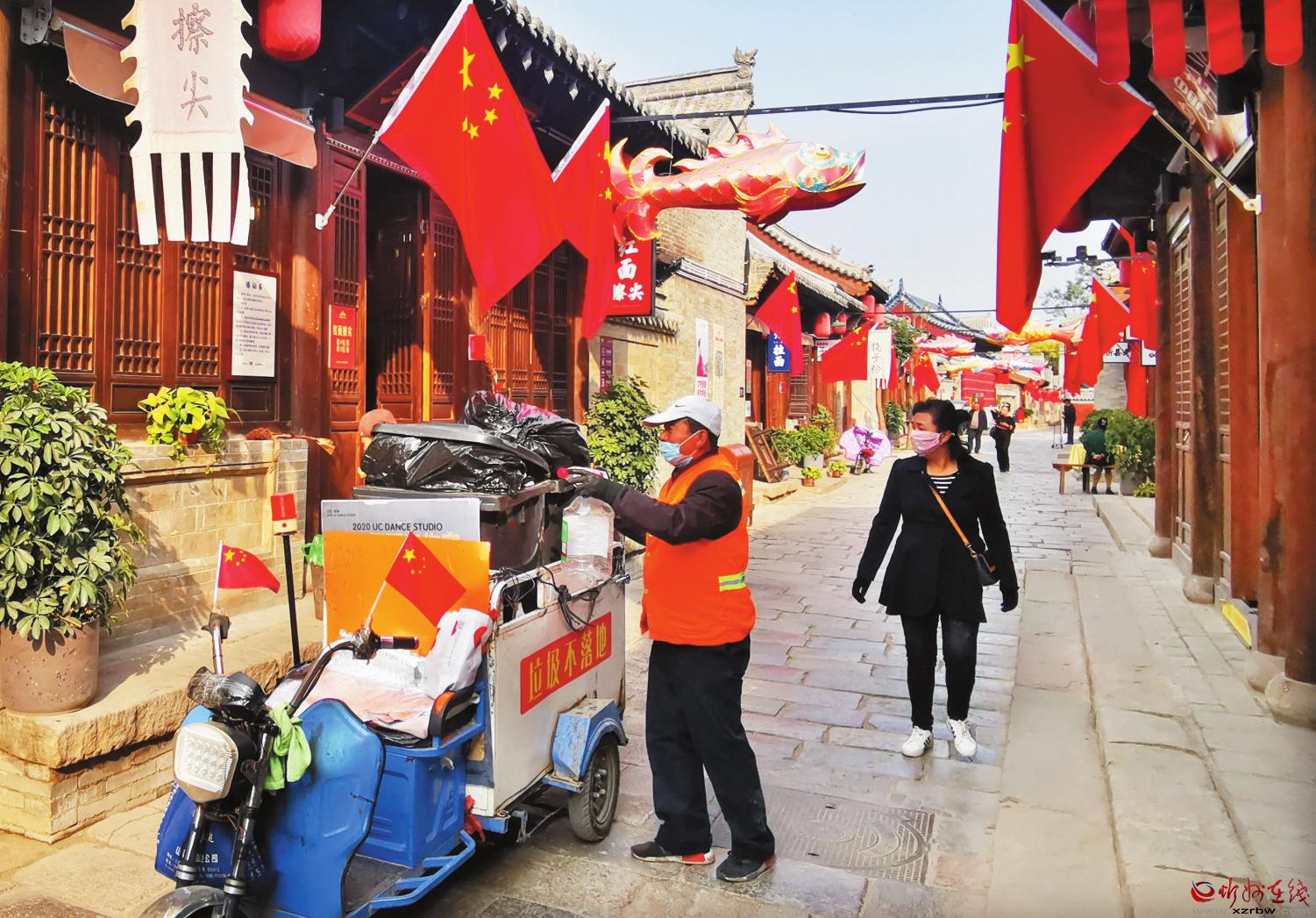 10月14日,忻州古城的環(huán)衛(wèi)工人正在上門(mén)收運(yùn)沿街商戶(hù)產(chǎn)生的垃圾,保證日產(chǎn)日清,垃圾不落地。(張存良 攝)