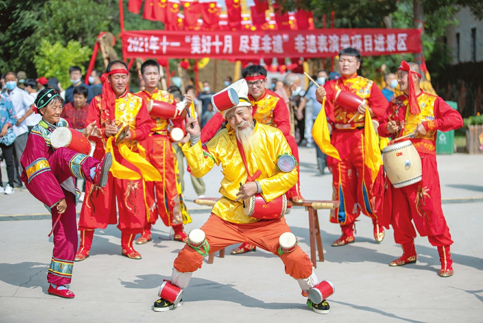 10月2日,民間藝人在鹽湖區(qū)東郭鎮(zhèn)嵐山根景區(qū)表演國家級非遺“萬榮花鼓”。國慶長假期間,運城市鹽湖區(qū)東郭鎮(zhèn)嵐山根景區(qū)在做好疫情防控的同時,推出“非遺進(jìn)景區(qū)”、蒲劇展演等豐富多彩的民俗活動,吸引了眾多游客前來游玩。(閆鑫攝)