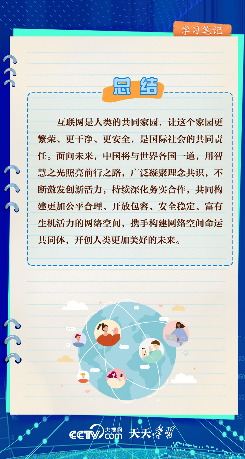 天天學(xué)習(xí)“互聯(lián)網(wǎng)發(fā)展是無國界、無邊界的,利用好、發(fā)展好、治理好互聯(lián)網(wǎng)必須深化網(wǎng)絡(luò)空間國際合作,攜手構(gòu)建網(wǎng)絡(luò)空間命運(yùn)共同體。”面對日益發(fā)展擴(kuò)大的網(wǎng)絡(luò)空間,習(xí)近平主席倡導(dǎo)構(gòu)建網(wǎng)絡(luò)空間命運(yùn)共同體,為推動(dòng)全球網(wǎng)絡(luò)空間互聯(lián)互通、共享共治注入中國智慧。