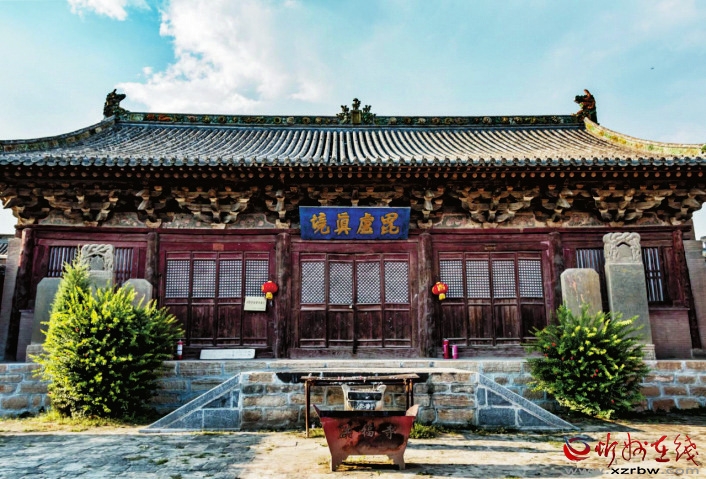 該寺建于高7米的土臺之上,四周筑高堡圍墻,“踞高而臨深”。寺內(nèi)現(xiàn)存建筑除大殿外,還有東配殿5間,西配房5間,庫房3間。正殿懸匾“毗廬真境”。面闊5間,七檁六椽,懸山頂花琉璃獸脊。斗拱六鋪作單抄雙下昂,補間斗拱斜拱一朵。