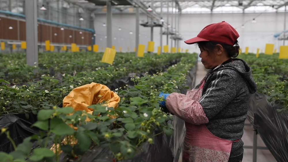 智慧農(nóng)場玻璃溫室現(xiàn)共種植三個品種、八萬株草莓,均為自主繁育的草莓苗。科學(xué)種植促進(jìn)了豐產(chǎn),兩座玻璃溫室均可實(shí)現(xiàn)一年四季連續(xù)生產(chǎn)。