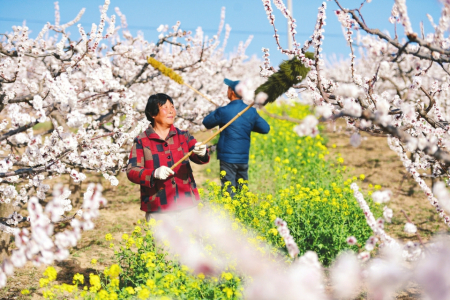 3月19日,永濟(jì)市韓陽鎮(zhèn)長旺村杏園里,杏農(nóng)正在對杏花進(jìn)行授粉作業(yè)。李向東攝