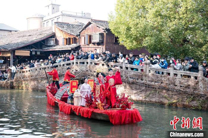在浙江紹興安昌古鎮(zhèn),記者到訪時,在碧水之上,一場明制婚禮正在舉行,再現(xiàn)了烏篷船接親的當(dāng)?shù)鼗樗?。從單純表演到定制化服?wù),今年“五一”假期就有新人預(yù)訂了自己的水上婚禮。