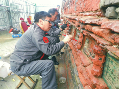 專家正在對四龍壁進行修復。解州關帝廟文物保護所供圖