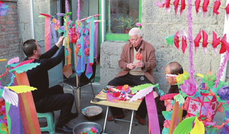 記者在現(xiàn)場看到,制作好的炮燈上有飄帶、繡球等裝飾,每盞炮燈不盡相同,畫有禾苗、動物等不同圖案,寓意五谷豐登、六畜興旺,“孔雀展翅”“雄羊抵頭”“駿馬奔馳”等主題的炮燈活靈活現(xiàn)?!霸谖业挠洃浝铮覀兇迥昴甓加兄谱魇止づ跓舻膫鹘y(tǒng),保存好的炮燈能用上兩年,燈架能代代相傳,我們有義務將這種技藝傳承發(fā)揚下去……”67歲的村民翟慶如是村里制作炮燈的“行家”,他現(xiàn)場拿起一張彩紙給記者折起了炮燈上的裝飾。