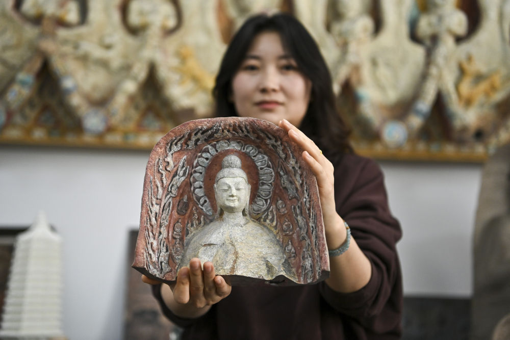 4月16日,在云岡研究院數(shù)字化保護(hù)中心展廳,工作人員王娜展示一款3D打印佛像模型。