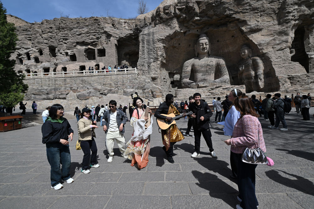 4月15日,在云岡石窟,身著傳統(tǒng)服裝的演員和游客互動(dòng)。