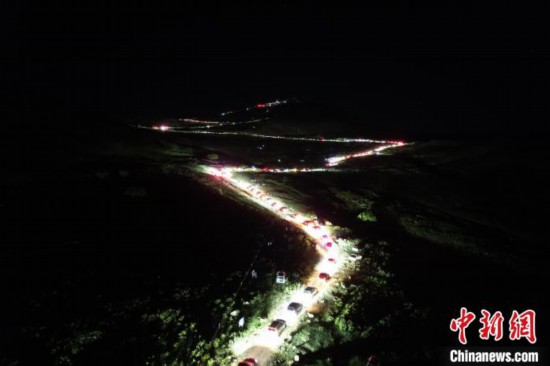 6月8日凌晨,蜿蜒崎嶇的盤(pán)山路,祭祀敖包的隊(duì)伍宛若游龍。 崔博群 攝
