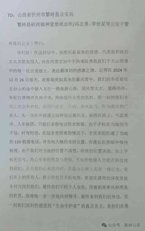 2025年1月1日,繁峙縣公安局收到了來自廣東省佛山市市民趙岸華等4人聯(lián)名寄來的感謝信,信中表達(dá)了對(duì)繁峙公安局神堂堡派出所民警頂風(fēng)冒雪深夜馳援,及時(shí)救助其脫險(xiǎn)的感激之情。