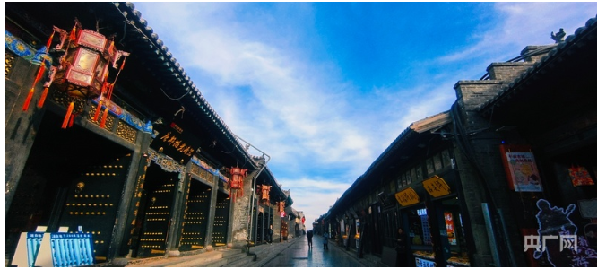 日昇昌票號(hào)坐落于平遙古城西大街(央廣網(wǎng)記者 郎麒 攝) “平遙古城是中國(guó)漢民族城市在明清時(shí)期的杰出范例,為人們展示了一幅非同尋常的文化、社會(huì)、經(jīng)濟(jì)及宗教發(fā)展的完整畫卷?!?997年12月平遙古城列入世界文化遺產(chǎn)之時(shí),聯(lián)合國(guó)教科文組織對(duì)平遙古城做出了如此評(píng)價(jià),可以說(shuō)平遙古城是一部用秦磚漢瓦寫就的千年古書,每一條磚縫里都濃縮著歷史的印記。