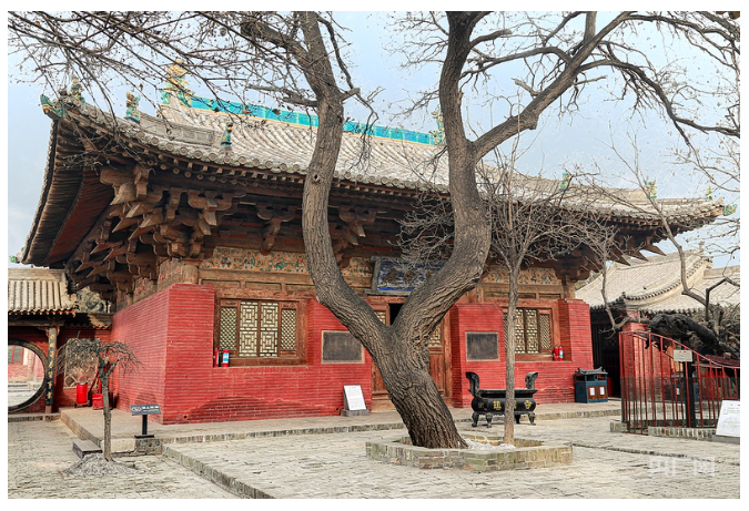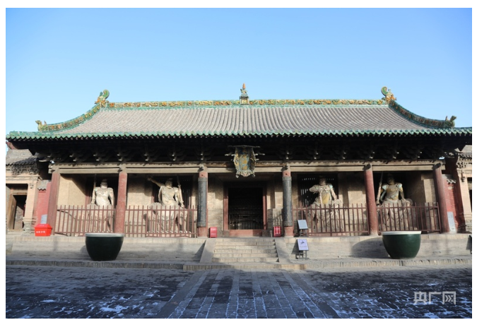 鎮(zhèn)國(guó)寺外景(央廣網(wǎng)記者 郎麒 攝) 鎮(zhèn)國(guó)寺創(chuàng)建于五代時(shí)北漢天會(huì)七年,即公元963年,系皇家赦建,距今已有一千余年的歷史?,F(xiàn)存五代、元、明、清各時(shí)期建筑44間,彩塑51尊,壁畫100余幅。