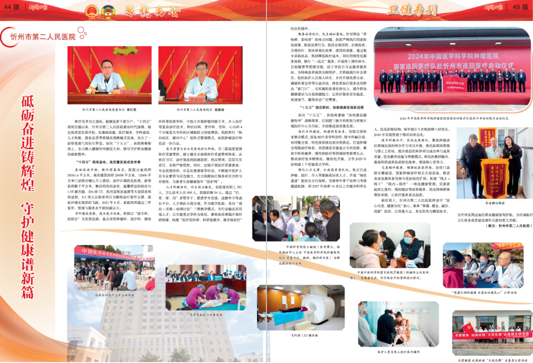 醫(yī)療關(guān)乎民生福祉,健康連著千家萬(wàn)戶?!笆奈濉币?guī)劃實(shí)施以來(lái),忻州市第二人民醫(yī)院緊扣時(shí)代脈搏,錨定高質(zhì)量發(fā)展目標(biāo),在基礎(chǔ)設(shè)施、醫(yī)療服務(wù)、學(xué)科建設(shè)、人才科教、服務(wù)品質(zhì)等領(lǐng)域?qū)崿F(xiàn)跨越式發(fā)展,交出了一份厚重提氣的民生答卷。面向“十五五”,醫(yī)院將乘勢(shì)而上,全力融入健康忻州建設(shè)大局,續(xù)寫守護(hù)群眾健康的嶄新篇章。